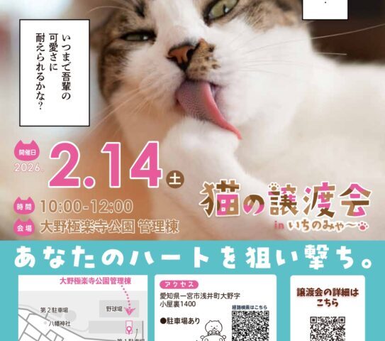 主に一宮市内で保護猫活動を行っているボランティアさんによる猫の譲渡会を行います。 猫を家族に迎えたい方のお越しをお待ちしています。 【行事名 […]