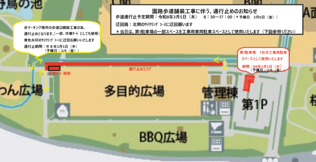 園路舗装工事に伴い、管理棟北側歩行者用園路の一部が、下記の日程で通行止めになります。