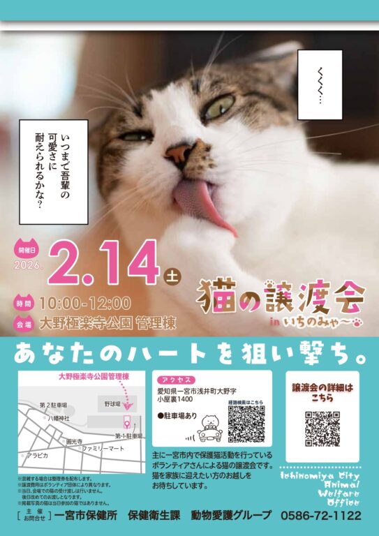 主に一宮市内で保護猫活動を行っているボランティアさんによる猫の譲渡会を行います。 猫を家族に迎えたい方のお越しをお待ちしています。 【行事名 […]