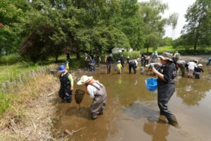 野鳥の池で増えすぎているガマを一部取り除き、ウシガエルやザリガニといった外来生物を捕獲し、多様な生き物の住める池に復活させます。